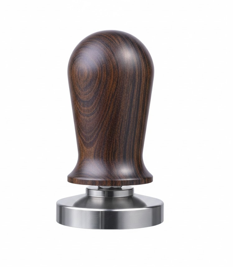 A calibrated 53mm espresso tamper made with a stainless steel flat base and a smooth wooden handle. It delivers consistent 30 pound pressure with a spring loaded design, which helps you produce even shots every time. Ideal for Breville 54mm portafilters and perfect for both beginners and experienced baristas.